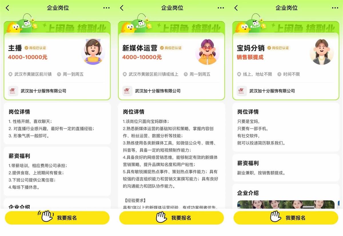 艳姐说,看到工厂里很多宝妈喜欢在闲鱼上卖闲置,身边也有不少朋友在闲鱼搞副业,“感觉用户群体和我的招聘需求非常吻合,就抱着试试看的心态在闲鱼上招人,没想到一下子火了!”