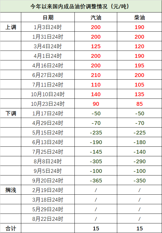 参照“10个工作日”调价规则,国内成品油价将于明天(11月6日)24时进行调整。