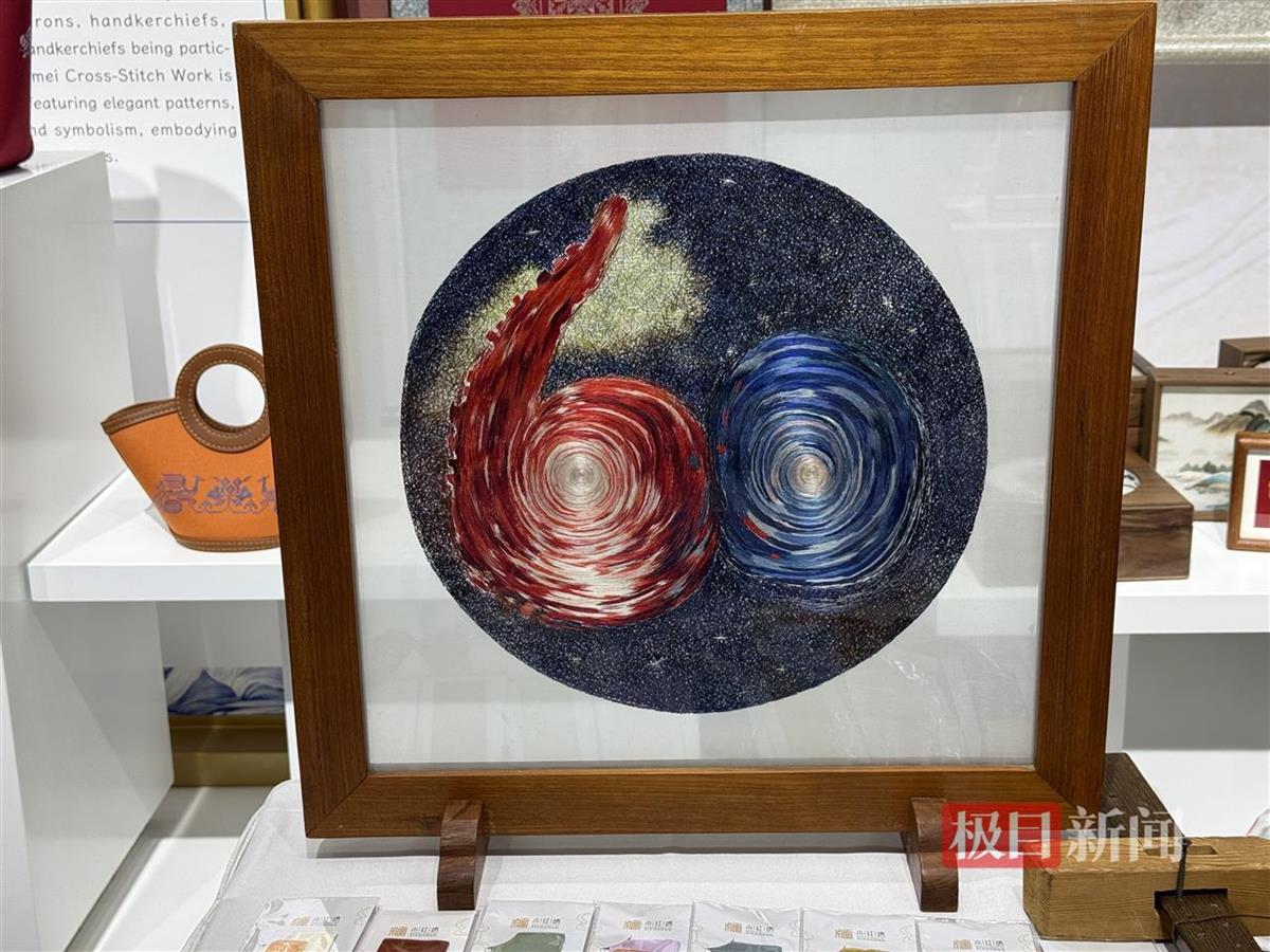 在大冶刺绣展台,由代表性传承人刘小红亲自设计并主绣的作品《星云之梦》,曾跟随神舟十一号飞船遨游太空,这是中国首次将非遗刺绣作品镶嵌在太空舱内跟人类一起进入太空,向全世界展示着中国非遗的魅力。