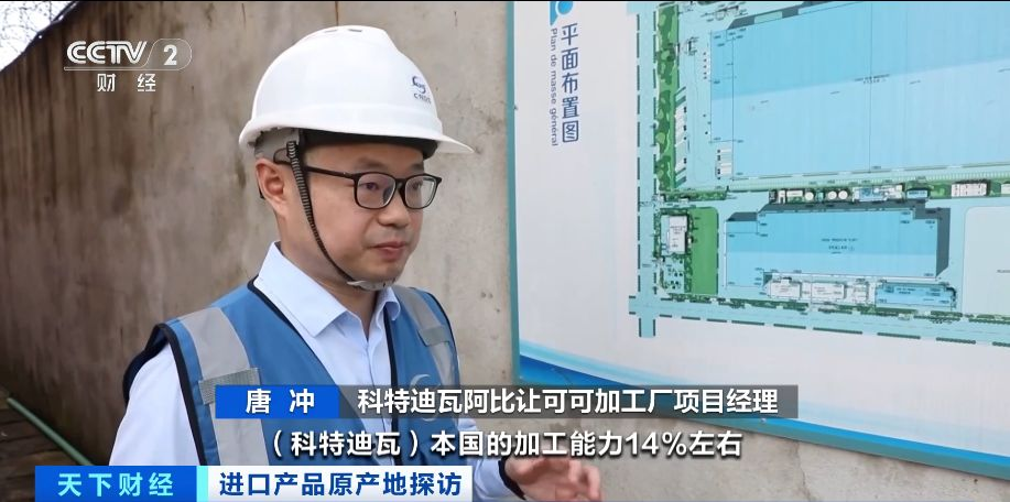 科特迪瓦阿比让可可加工厂项目经理唐冲:我们预计可以提升科特迪瓦的加工能力14%左右。通过延长产业链、设立加工厂,提升效益大概36%。