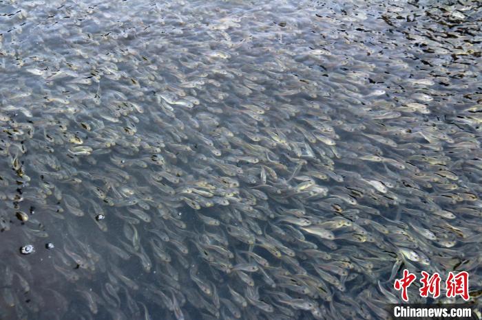 暖阳下的福建省宁德福鼎市沙埕港波光潋滟,10万尾大黄鱼抗病新品系鱼苗在水中欢快畅游,不时翻涌出一道道金色海浪。