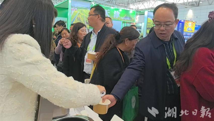 逛展客商正在品尝湖北展区的大米(湖北日报全媒记者魏萌叶摄)