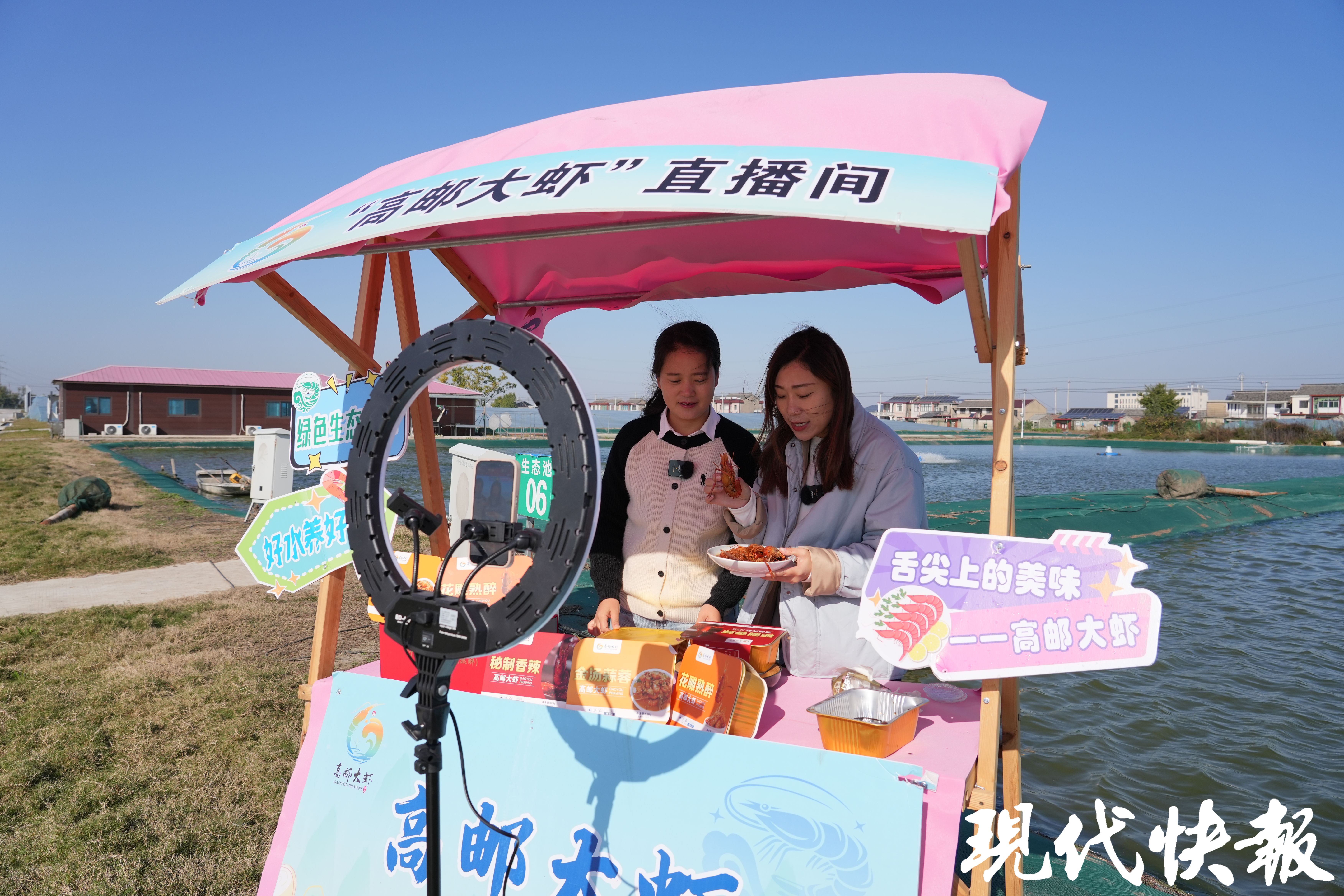 “家人们,现在我们示范园的活虾已经清塘,但是深加工的柠檬熟醉大虾依然还有售,也非常好吃……”11月10日,在扬州高邮市龙虬镇的高邮大虾现代农业高质量发展示范园塘口,90后新农人黎玲和杨宝萍正在进行高邮大虾的直播,“我们也希望借助‘双十一’大促活动,让更多人品尝、了解我们的高邮大虾。”