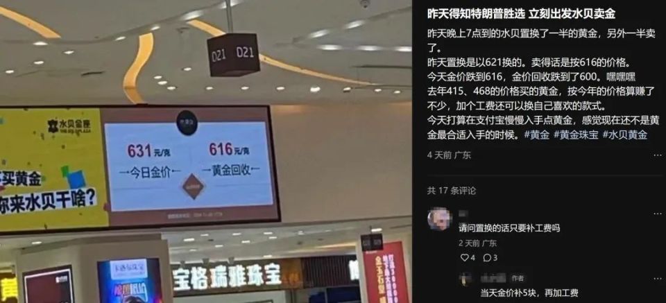 据公开资料,近日在社区平台上,有投资者发帖表示,“得知特朗普胜选,立即出发水贝卖金”。