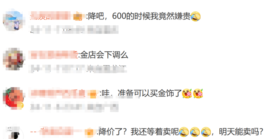 对于金价近期跳水,有网友说“降价了?我还等着卖呢”,也有人说“准备入手了”。