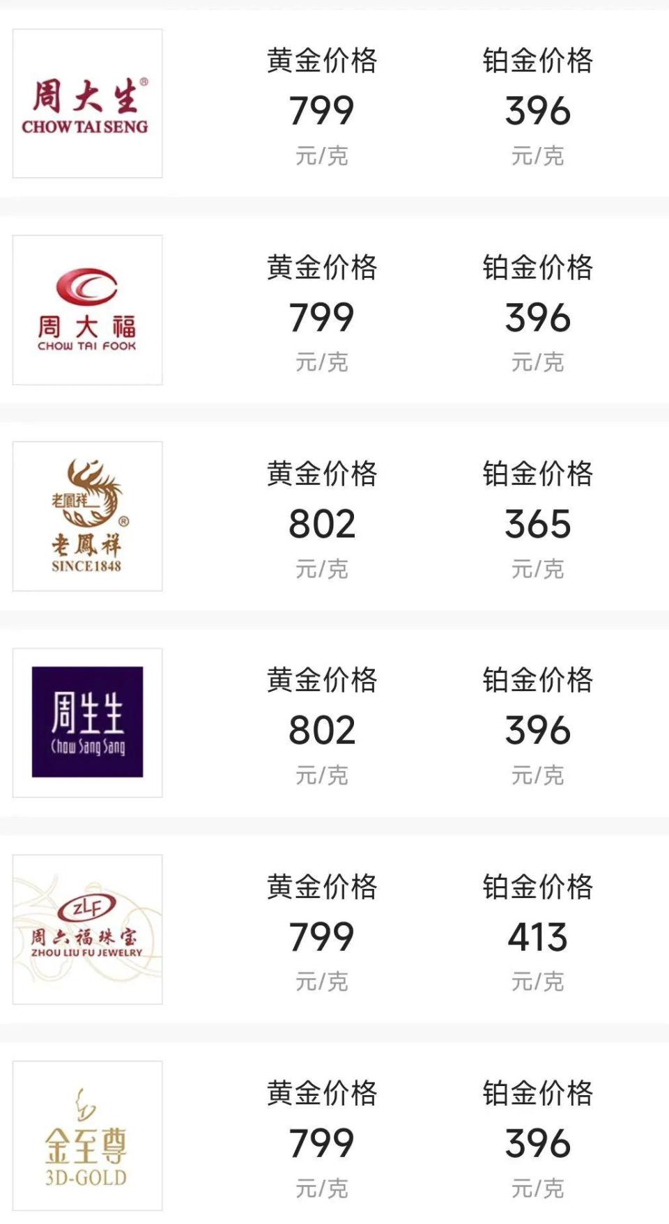 而在一周前,多家品牌金饰店金价已突破820元/克关口,其中较高的达826元/克。