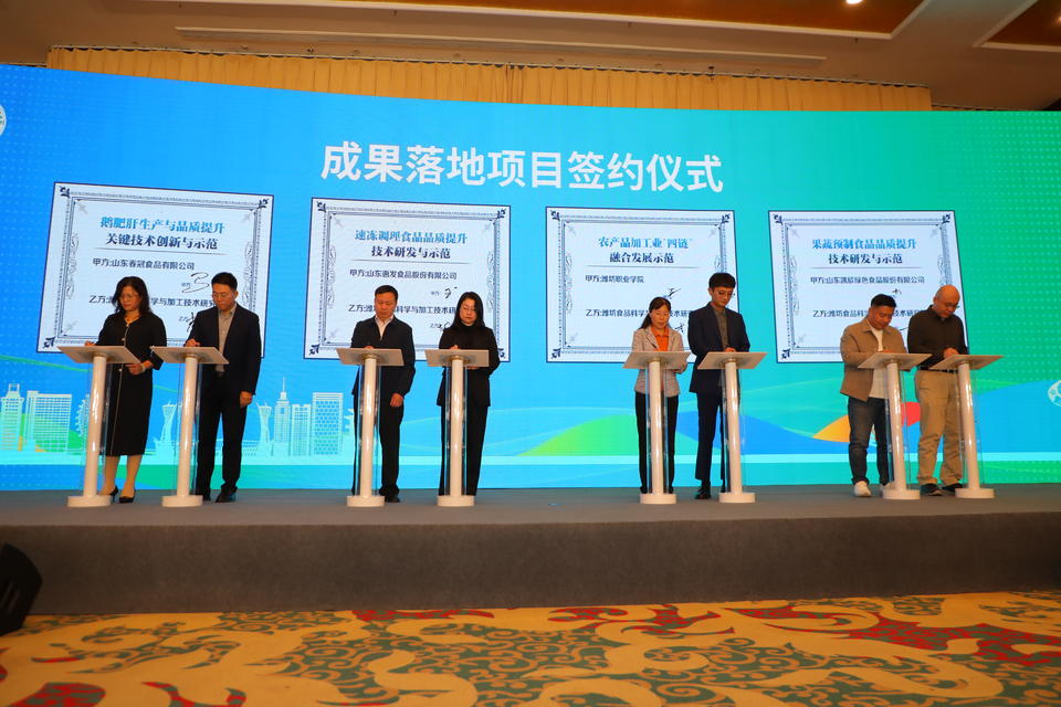 会上,聚德华天控股有限公司、山东春冠食品作交流发言;揭牌成立国家农产品加工科技创新联盟智能加工装备实验室;潍坊食品科学与加工技术研究院作情况介绍和成果推介,并与山东春冠食品、山东惠发食品、山东凯欣绿色食品等8家企业机构项目签约。