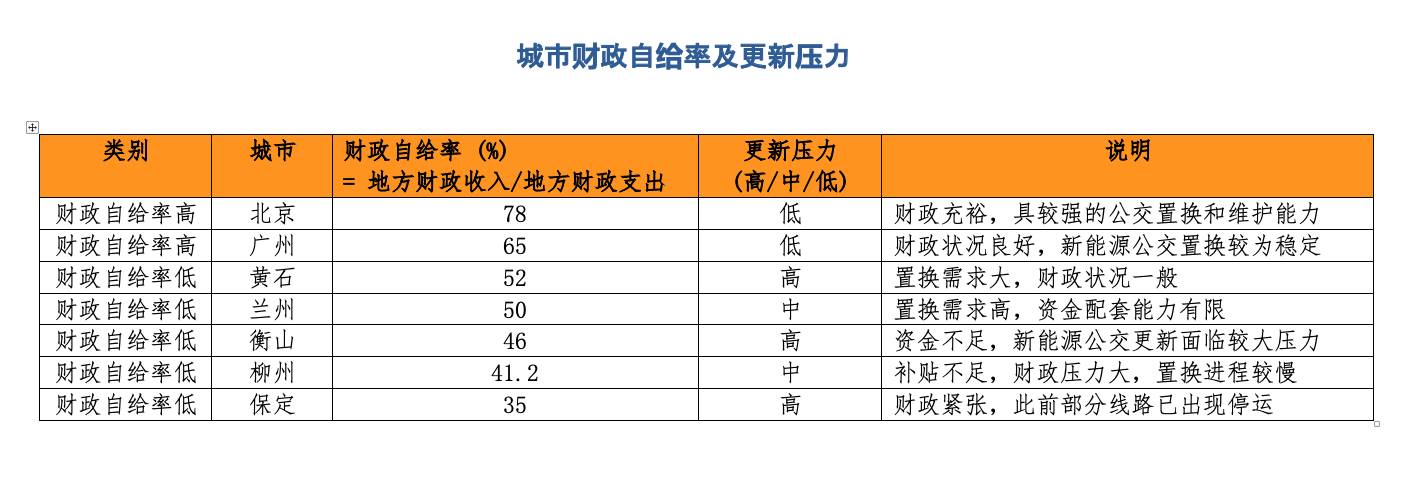 在中国城市公共交通协会新能源分会秘书长麦文杰看来,相比于北京等一线城市,三线城市如保定和柳州在公交车更新方面对中央补贴的依赖较高,即:但地方财政的配套能力有限。尽管国家提供部分补贴,地方仍需承担一定比例的费用,这对财政紧张的地方形成了较大压力。目前的补贴政策规定:国家对车龄超过8年的新能源公交车给予每辆平均8万元的更新补贴,对动力电池更换的补贴为每辆4.2万元,其他补贴则需地方财政配套支持。