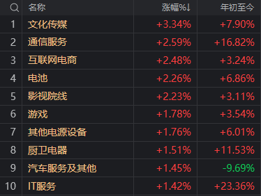 全天来看,文化传媒方向始终维持领涨地位,影视院线、短剧游戏、AI等概念涨幅居前。