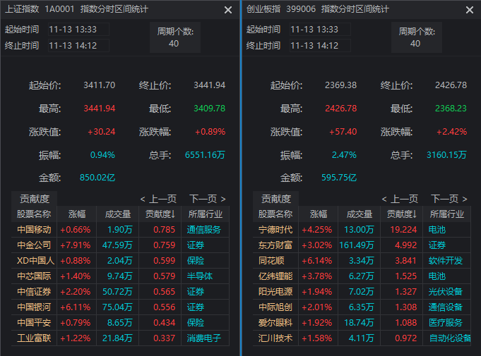 同花顺数据显示,13:33~14:12的拉升段,上证指数和创业板指,各自贡献度居前的个股如下
