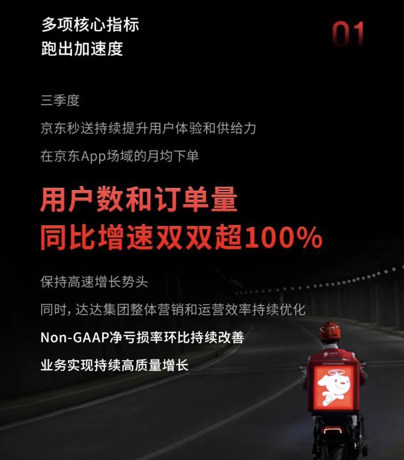 达达方面表示,得益于整体营销及运营效率持续优化,三季度,达达集团Non-GAAP净亏损率持续环比收窄,盈利能力持续改善。