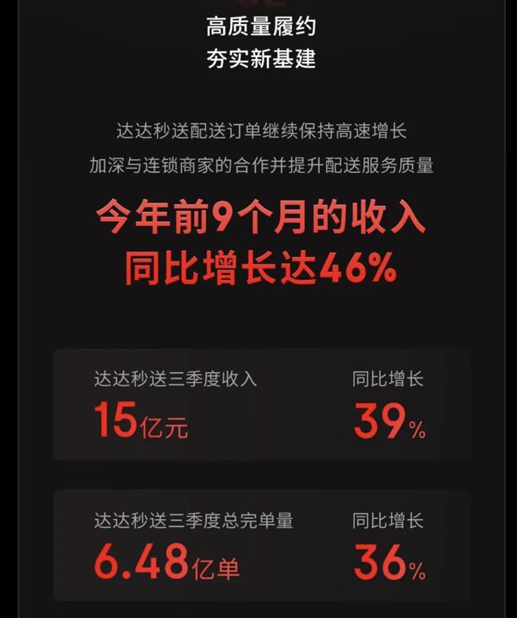 同时,达达秒送配送订单继续保持强劲增长,今年前9个月的收入同比增长46%。三季度,达达秒送持续加深与连锁商家的合作并提升配送服务质量,收入同比增长39%至15亿元,总完单量同比增长36%至6.48亿单。