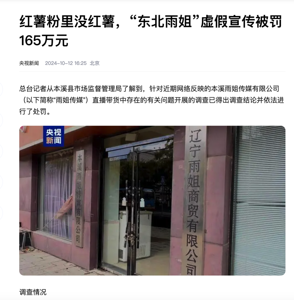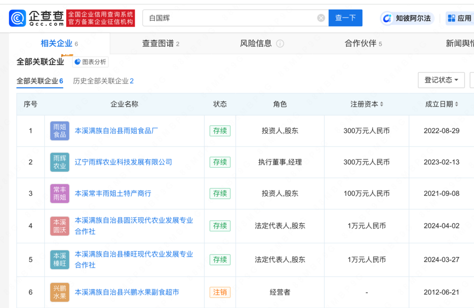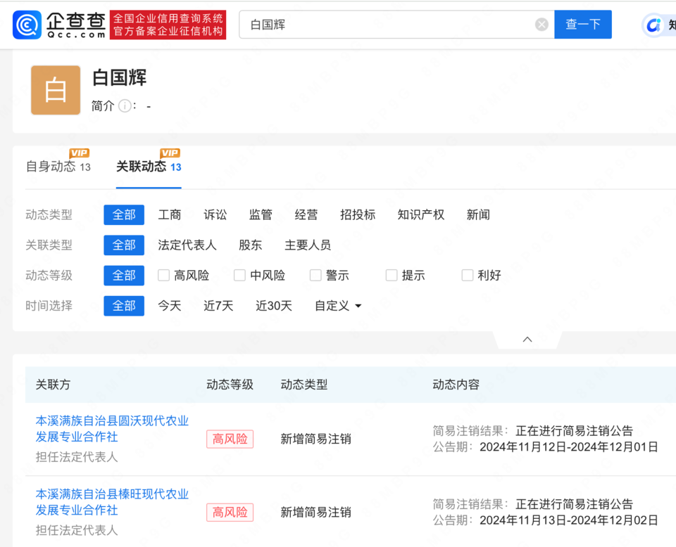 企查查APP显示,近日,本溪满族自治县榛旺现代农业发展专业合作社、本溪满族自治县圆沃现代农业发展专业合作社分别新增简易注销公告,公告期自11月13日至12月02日及11月12日至12月01日。上述两家合作社法定代表人均为白国辉(东北雨姐丈夫),当前白国辉名下管理5家存续企业,包括本溪满族自治县雨姐食品厂、本溪常丰雨姐土特产商行等。此前,本溪县市场监督管理局针对东北雨姐方直播带货中存在的有关问题,作出没收违法所得和罚款共计165万元的行政处罚。