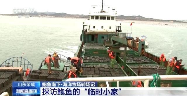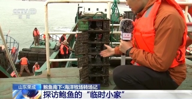 总台记者 李秉禅:在山东荣成的爱莲湾海域,几十名工作人员正在将一个个黑色的笼子从小船装到大船上,这些黑色的笼子就是鲍鱼笼,也就是鲍鱼的“家”。