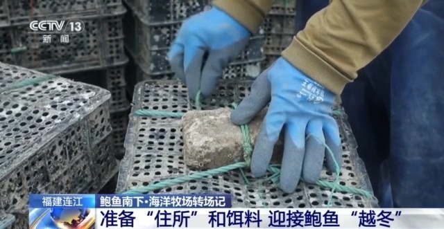 为迎接鲍鱼的到来,养殖户们半个月前,就开始做准备了。他们先将养殖笼绑上砖头,再装船运到养殖渔排上,南下的鲍鱼就将在这些养殖笼里生活到明年5月份。