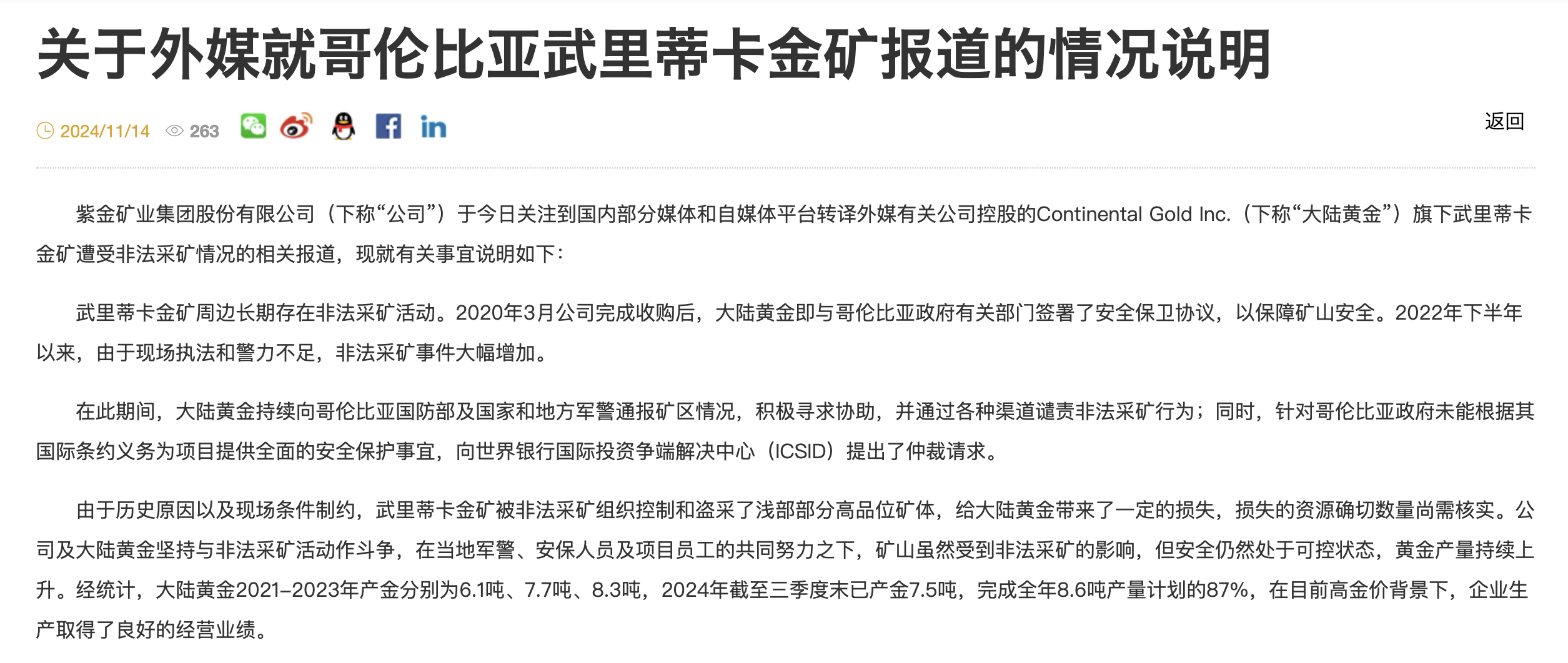 2023年5月,紫金矿业曾在官网发布《关于哥伦比亚武里蒂卡金矿遇袭事件的强烈谴责声明》(下称“《声明》”)。该《声明》中提到,哥伦比亚当地时间2023年5月17日下午,紫金矿业控股子公司大陆黄金旗下武里蒂卡金矿遭遇爆炸恐怖袭击。事件共造成大陆黄金外协安保公司和劳务公司的2人遇难,以及包括4名哥伦比亚国家警察在内的14人受伤,无中方人员在袭击中受伤。初步调查显示,袭击事件为当地非法采矿组织所为。