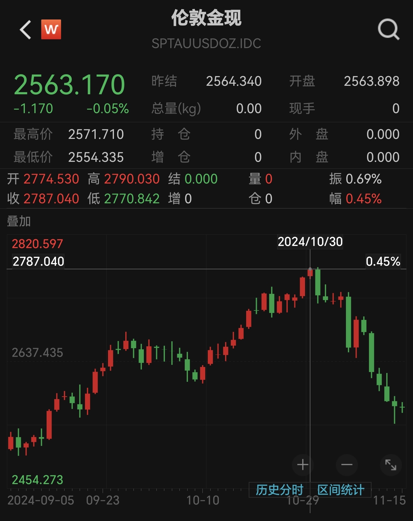 10月底,黄金终结了上涨趋势,在短短半个月时间价格连续下挫,不仅连续跌破2700美元/盎司和2600美元/盎司整数关口,11月14日金价一度跌穿2550美元/盎司。截至红星新闻记者15日发稿时,黄金价格略微回升至2563美元/盎司。