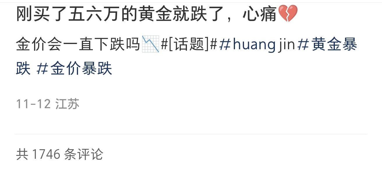 红星新闻记者注意到,黄金暴跌引发了不少投资者的讨论,一位江苏网友发帖:“刚买了五六万元的黄金就跌了,心痛。”引起不少网友的共鸣,不少感同身受的网友在下面发表留言,共收获了1746条评论。