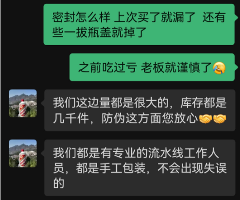 通过和他们的交谈内容得知,商家A和商家B的价格差异主要在于防伪手段及假酒品质上。商家A称,很多二维码、芯片、胶帽都是需要技术制造,这些技术活都需要成本,“而且我们酒质也好,也要有合理的利润”。
