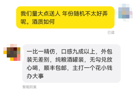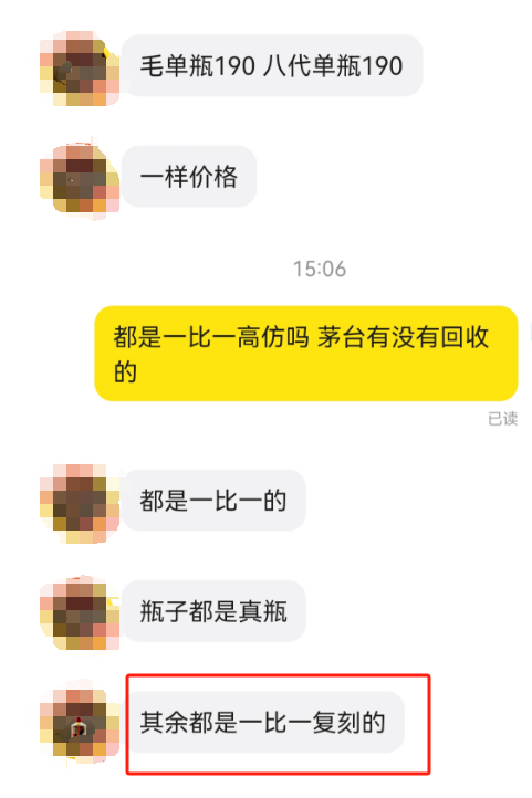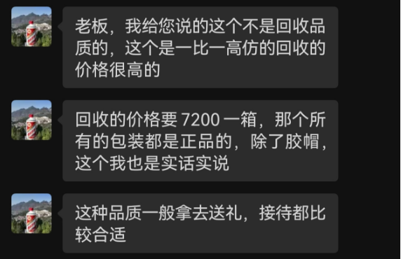 在交谈中记者得知,该商家售卖的“高仿”名酒共有两类,第一类则是从瓶身、瓶盖、包装、酒体“一比一还原”的产品;而第二类则是通过酒瓶回收灌装的产品,用他的话叫“回收品质”产品。