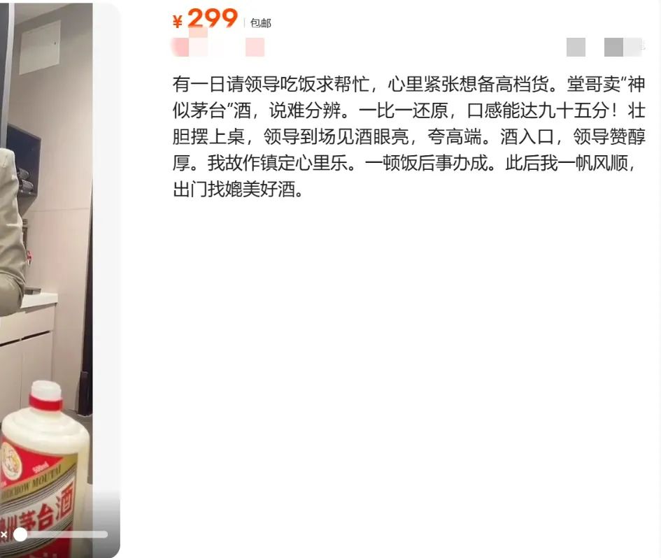 有一个商家竟然在产品介绍里这样写道:“有一日请领导吃饭求帮忙,心里紧张想备高档货。堂哥卖‘神似茅台’酒,说难分辨。一比一还原,口感能达九十五分!壮胆摆上桌,领导到场见酒眼亮,夸高端。酒入口,领导赞醇厚。我故作镇定心里乐。一顿饭后事办成。此后我一帆风顺……”