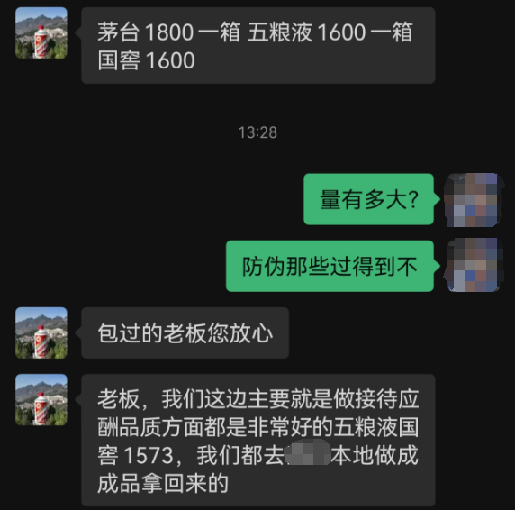 “茅台1800一箱,五粮液1600一箱,国窖1600(一箱)。”某IP地址显示为贵州的商家(以下简称商家A)很干脆地报出了价格,“我们这边量都是很大的,库存都是几千件。”