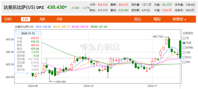 此消息公开后,11月15日,达美乐比萨美股盘前大涨,但当日收跌1.27%,报430.43美元/股。