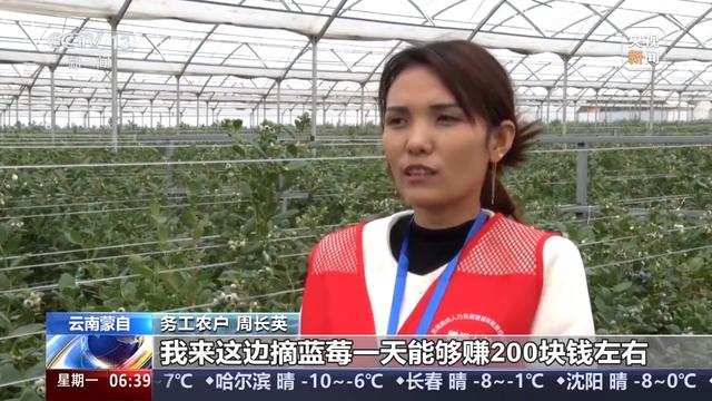务工农户 周长英:我来这边摘蓝莓一天能够赚200块钱左右,一个月有5000块钱左右的工资,还可以照顾家里老人还有小孩。