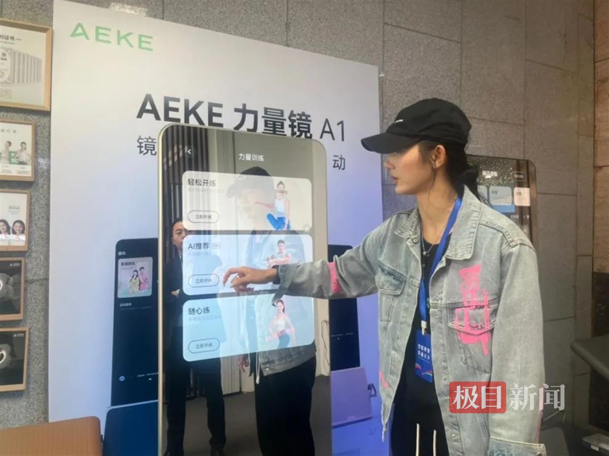 在文化用品城入口处,几位前来逛展的采购商被一排“超大手机”似的健身力量镜吸引,跑步、拉伸、做健美操,众人乐此不彼。“这是我们的AEKE力量镜A1,凭借其轻量化设计、智能化训练体系和高度定制化的运动方案,展现了颠覆传统的健身器材形象。”现场的AEKE工作人员一边答疑解惑,一边演示其功能。