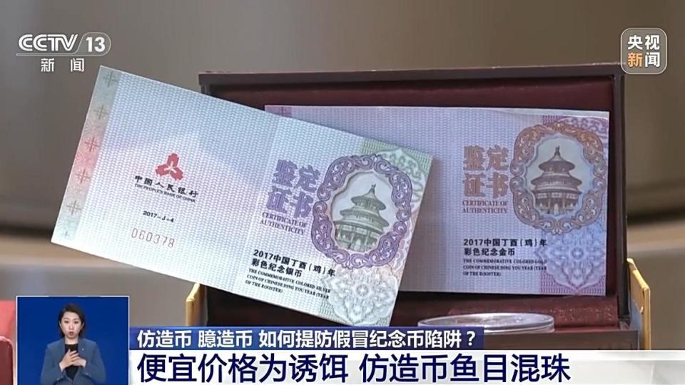 中国人民银行文联收藏协会副主席 李波:这两位老先生送来的币完全属于仿造币。所谓的仿造币,就是它照我们的真币看起来是一模一样,而且还有包装,还有证书。经过检测,成色和重量都不符。