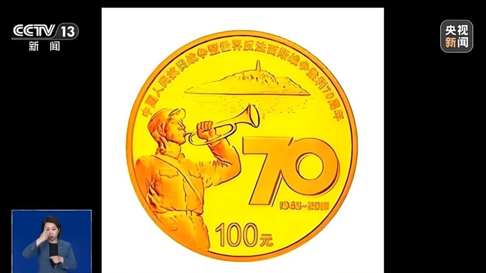 而中国人民银行发行的抗战胜利反法西斯胜利70周年纪念币,背面图案依次为:吹响抗战号角的八路军战士形象与延安宝塔山、延河水、数字“70”与时间“1945-2015”共同组成的标志性符号的组合设计。