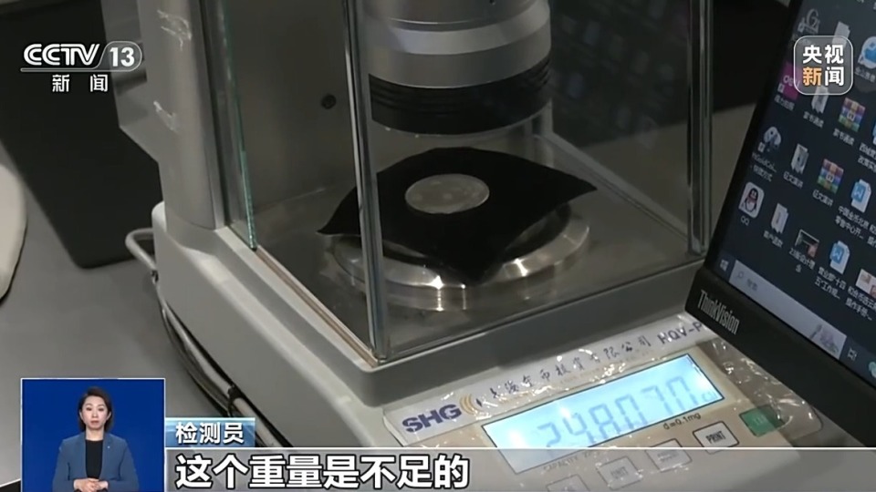 检测员:现在我们测的这个币的重量是29.8克左右,这个重量是不足的。这枚币的主要元素是铜,铜的含量是60%多,银的含量是2%多,我们正常官方标准含银量是99.9%,所以这枚币是假币。