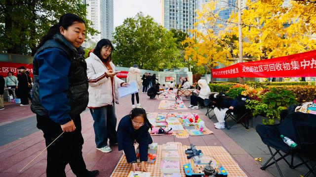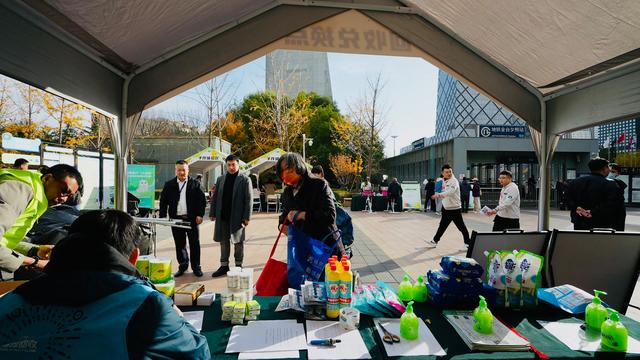 在北京财富中心广场上,科普问答区、互动游戏区、手作体验区、回收兑换区都热闹非凡。周边社区的居民和商户排着队,将旧家电、旧衣物、日常积攒的各类纸塑包装等可回收物进行称重回收,累计积分,然后兑换成纸巾、洗衣液、洗手液、垃圾袋等日常用品。