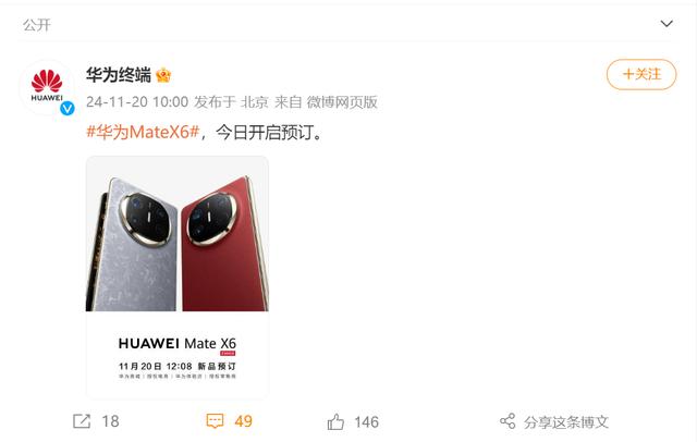华为终端11月20日在官微称,华为MateX6,今日开启预订。