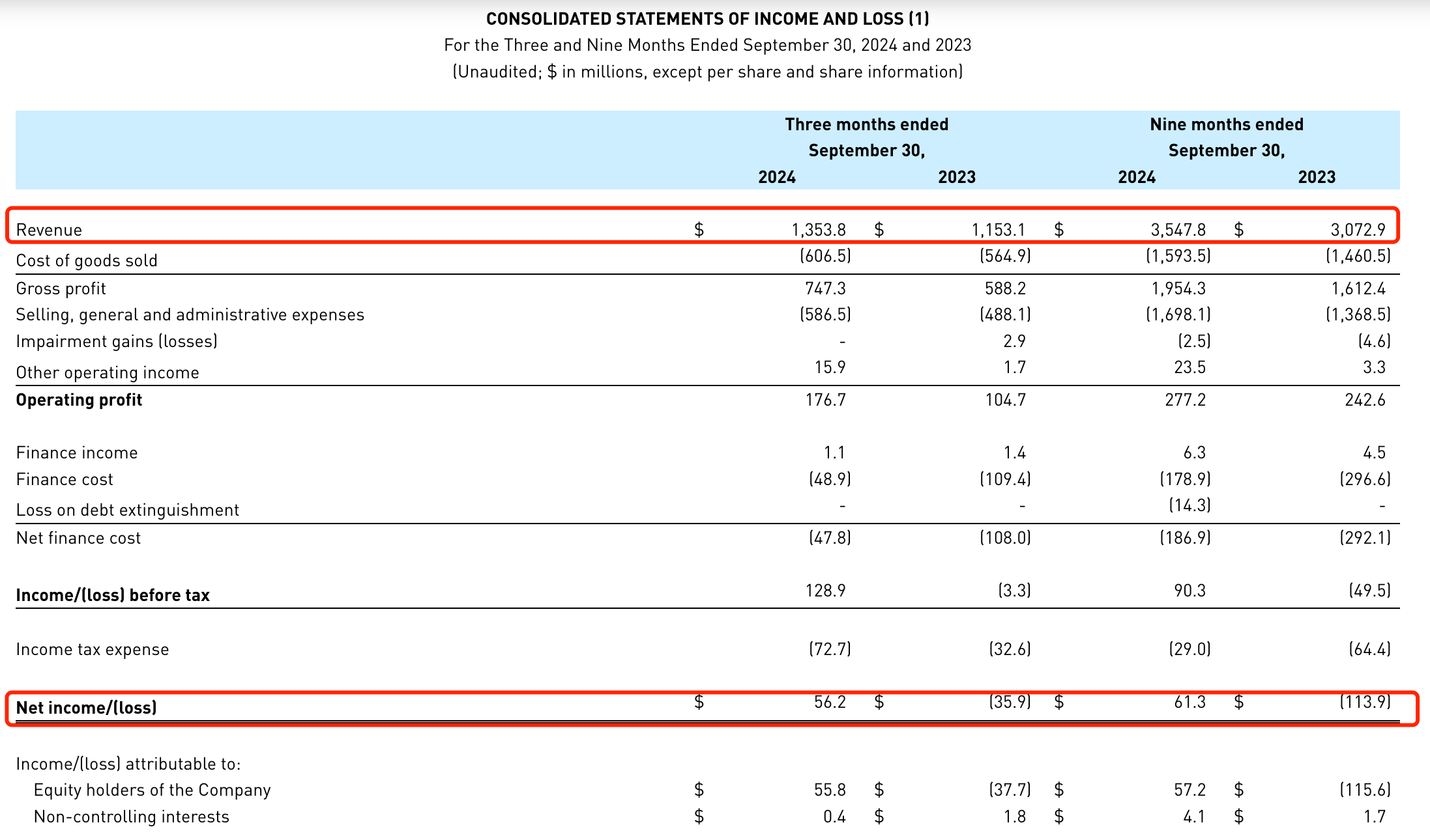 前三季度营收达35.48亿美元,同比增长15.45%;净利润达到6100万美元,去年同期为-1.14亿美元,实现扭亏为盈。
