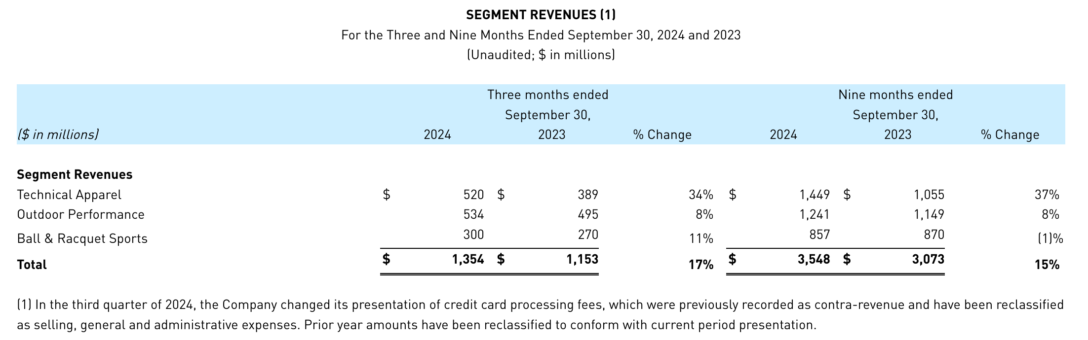 11月19日美股盘前,运动和户外品牌集团亚玛芬体育(NYSE:AS,AmerSports)发布2024年第三季度财务业绩。第三季度营收达13.54亿美元,同比增长17.4%,超出原有预期的12%至13%;净利润达到5620万美元,去年同期为-3590万美元,实现扭亏为盈。