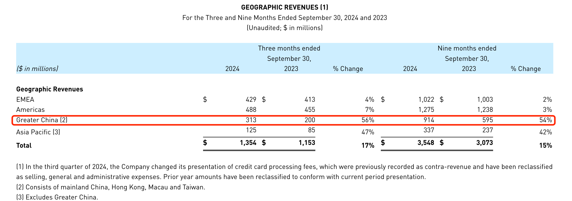 大中华区第三季度营收增超五成,上调全年业绩指引