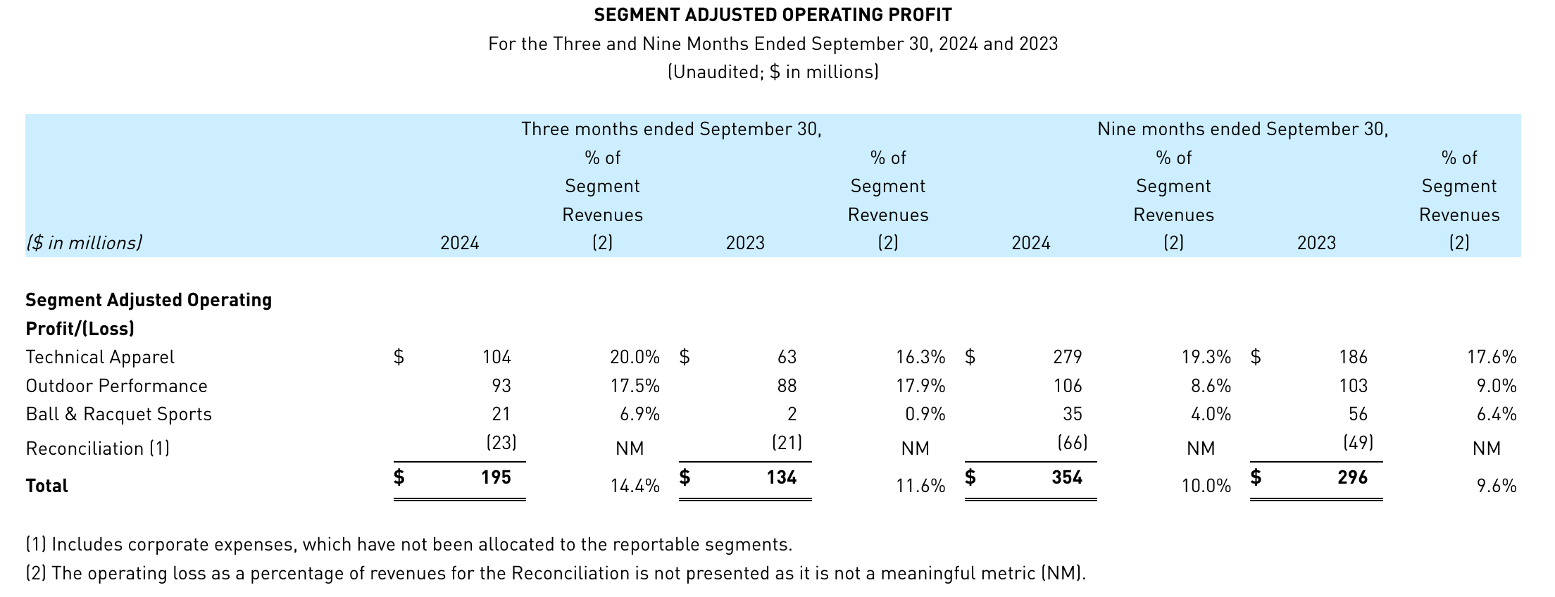 财报指出,第三季度亚玛芬毛利率同比上涨420个基点至55.2%;经调整营业利润率上升280个基点,达14.4%。其中,户外功能性服饰调整后营业利润率上升370个基点,达20.0%;山地户外服饰及装备下降40个基点,至17.5%;球类及球拍装备上升600个基点,达6.9%。