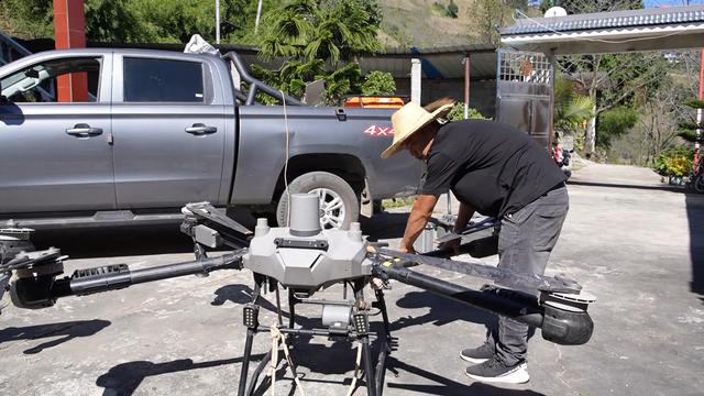 只见胡四林拿出对讲机,向无人机“飞手”下达起飞指令,随着螺旋桨的快速转动,挂着吊绳的无人机缓缓升空,很快便到达草果地上方,胡四林和家人用吊绳固定好草果后,再次下达起飞指令。