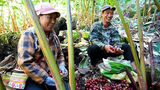 走了近2个小时陡峭湿滑的山路,记者跟随上江镇蛮英村大湾子组村民胡四林来到他家的草果地里,山腰沟箐间,连片的草果林郁郁葱葱,火红的草果格外显眼,阵阵草果香弥漫在空气中,种植户们正忙得不亦乐乎,熟练地采收着草果。“今年的雨水充足,草果的品质非常好,这几天的价钱能卖到4.5元到5元一斤,得趁着价格好赶紧采摘上市。”胡四林边忙碌着边告诉记者,不一会儿,一袋草果便装满了。