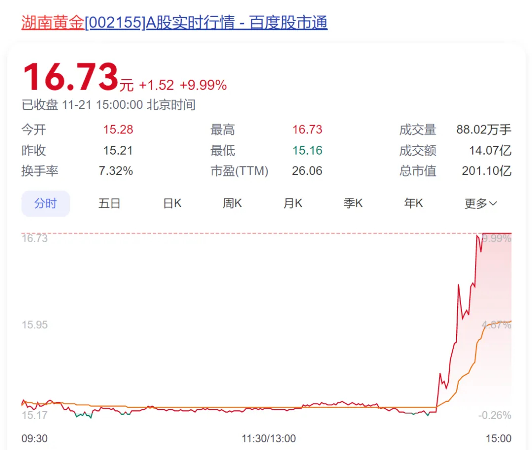 不过对湖南黄金近8万户股东来说(截至三季报数据),幸福来得过于突然。11月21日14:21分,湖南黄金股价还处在平盘的位置,随后快速被拉升,仅仅过了24分钟,在14:45分左右就达到了涨停价,并维持至收盘,且收盘时买一价位还有11.84万手买单。按照最新收盘价计算,公司总市值为201亿元。