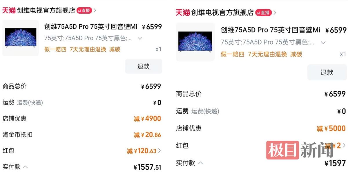 根据李先生提供的购物截图,极目新闻记者看到,这两台电视型号相同,也都是75英寸,原价6599元。使用了包括“满5000减4000”元优惠券在内,李先生还叠加了平台其他满减优惠,两台电视最终实付款金额分别为1557.51元和1597元。