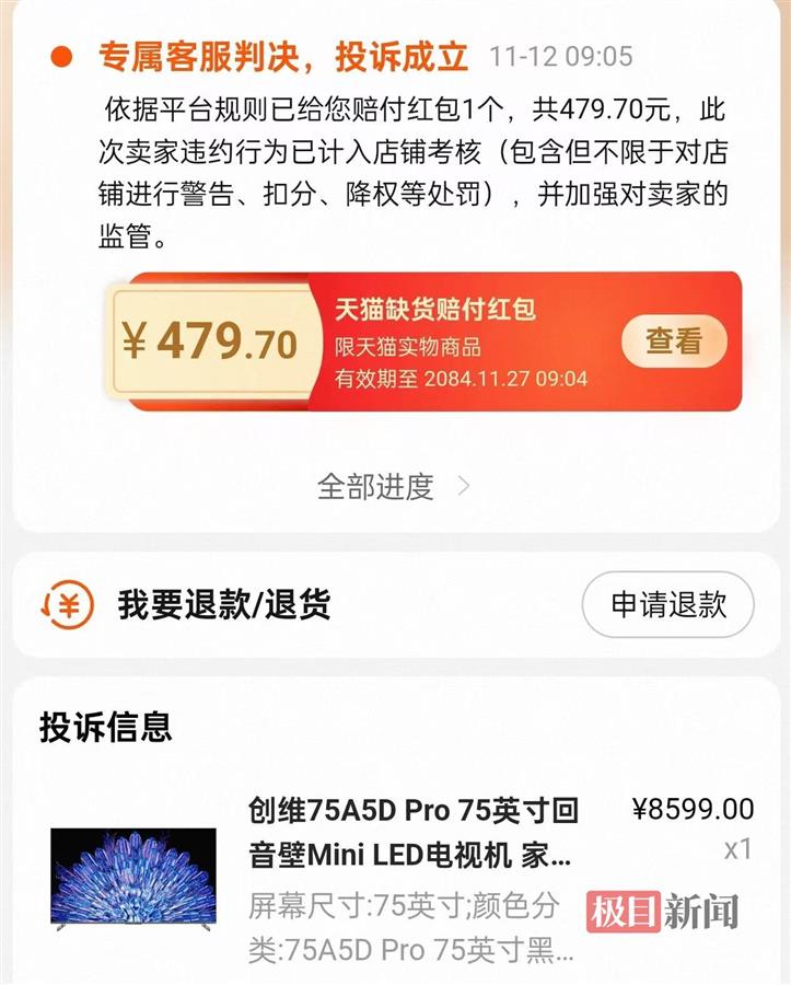 李先生家住湖北咸宁。11月20日,他致电极目新闻热线027-86777777反映,他在双11期间以优惠价购买的两台电视,因使用了大额优惠券,商家迟迟不发货,商家客服还要他主动退款。