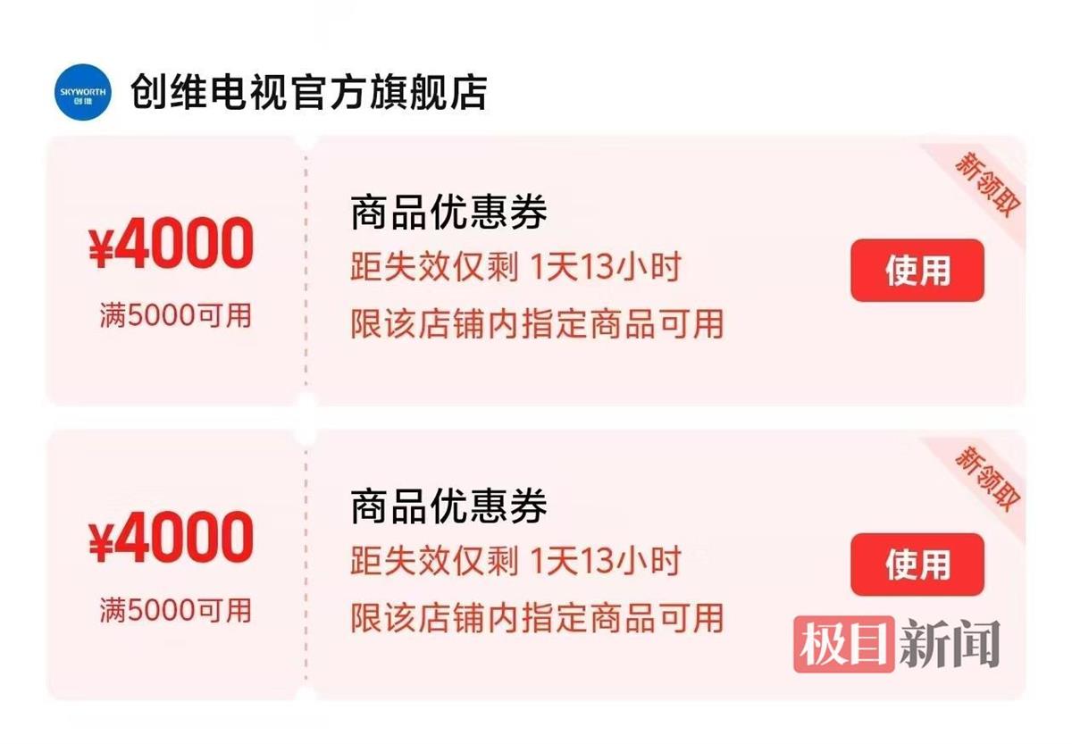 李先生介绍,他是11月10日晚,在电商平台创维电视官方旗舰店,抢了两张“满5000减4000”元的商品优惠券。因家中装修正好需要买电视,于是果断下手购买了。既然有这么大力度的优惠券,父母家电视也已经用了多年,他想着干脆给父母家也买一台新电视,于是又下了一单。