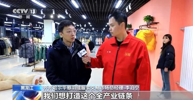 黑龙江还积极引进广东、浙江、江西等地服装纺织企业,推动成衣加工、羽绒服装、冰雪运动服装等项目落地。在齐齐哈尔,来自江西的这家企业就将羽绒服小镇和羽绒服交易市场打通,企业生产完订单直接进入市场销售。