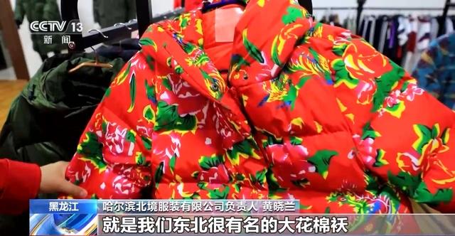 哈尔滨北境服装有限公司负责人 黄晓兰:东北很有名的大花棉袄都是羽绒服的面料了,也是我们定制定染的。