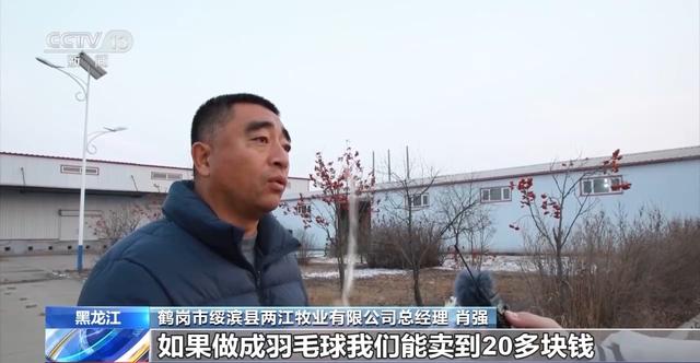 鹤岗市绥滨县两江牧业有限公司总经理 肖强:现在一根羽毛卖到7毛多,如果做成羽毛球能卖到20多块钱,一袋羽绒现在正常卖1万多元,如果分绒成高端羽绒能卖到5万多块钱。