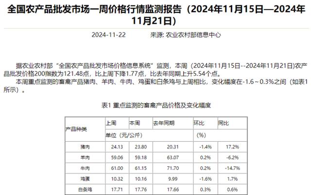 同时,根据农业农村部“全国农产品批发市场价格信息系统”监测,2024年11月15日--11月21日农产品批发价格200指数为121.48点,比上周下降1.77点,降幅为1.44%。