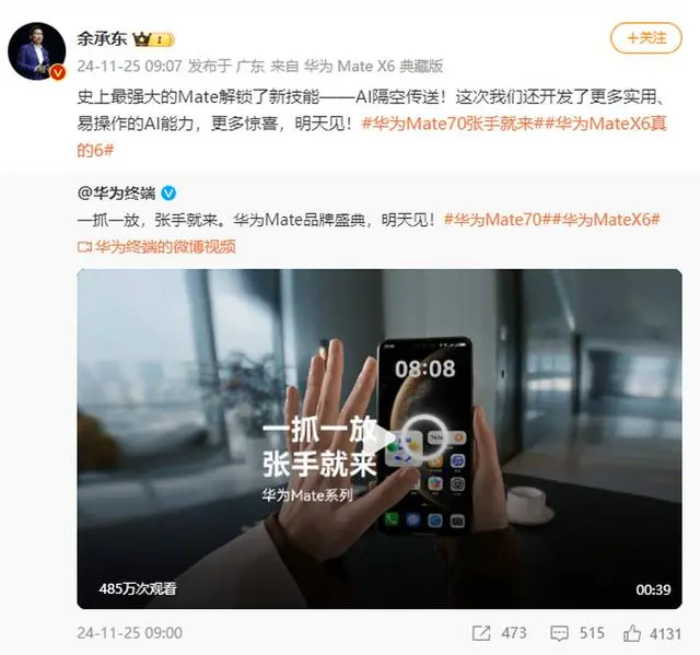 11月25日,@华为终端 配发视频并发文:“一抓一放,张手就来。华为Mate品牌盛典,明天见!”视频中,余承东展示了Mate70系列的一项新技能,让用户不直接触碰手机,通过简单的手势完成一张图片从一个手机到另一个手机的转移操作。