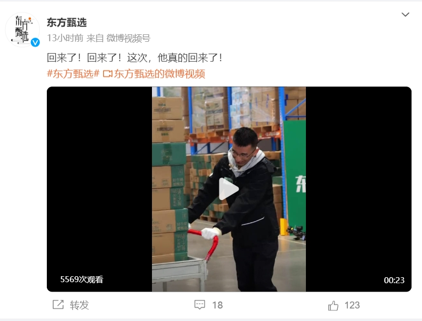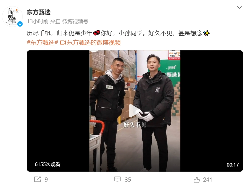 11月24日,东方甄选官方账号也发微博称:“回来了!回来了!这次,他真的回来了!”“历尽千帆,归来仍是少年,你好,小孙同学。好久不见,甚是想念。”